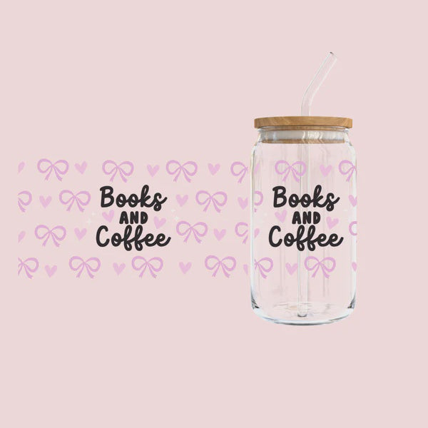 Glass Tumbler with Straw - Books, Bows & Coffee