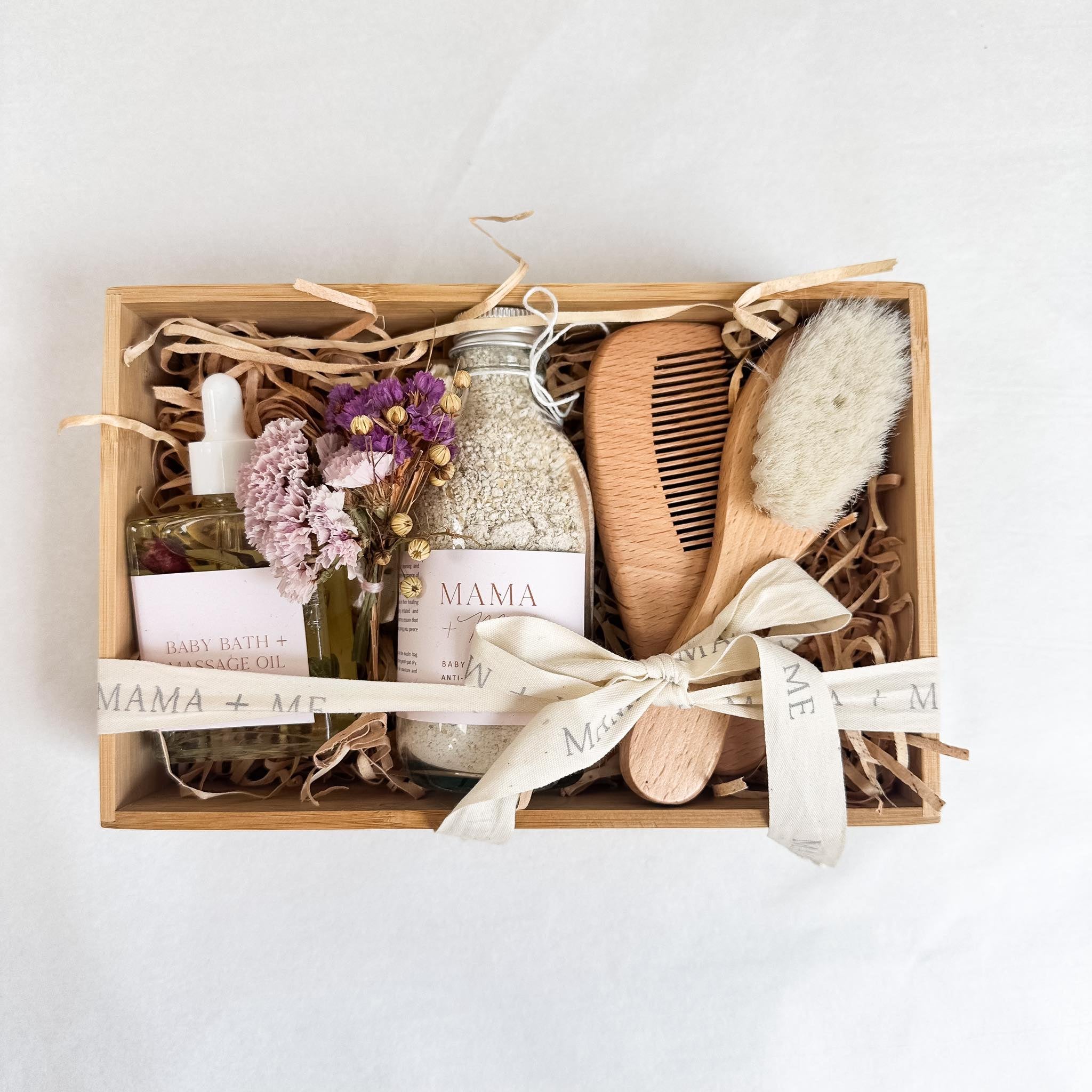 The perfect baby shower gift for a new mama to be packaged in a cute wooden box and wee botanical dried flower bunch.