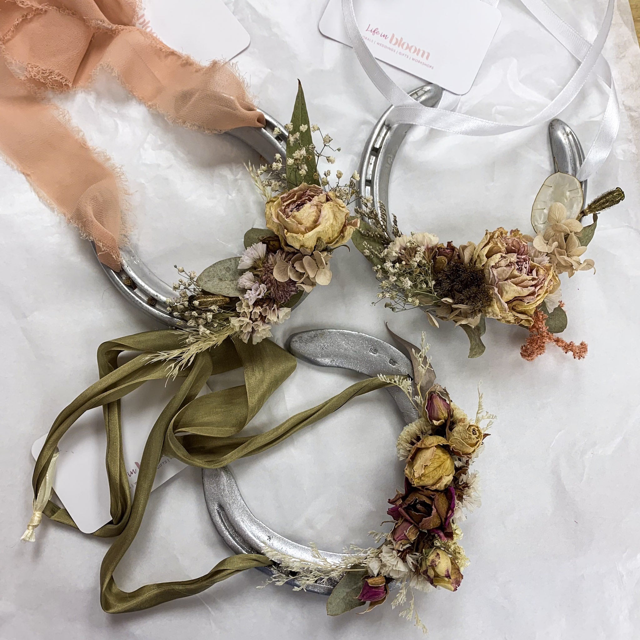 These horse shoes are real from North Canterbury, have been cleaned up with a lot of love, sprayed and decorated in gorgeous, delicate dried florals, with a pretty ribbon attached.