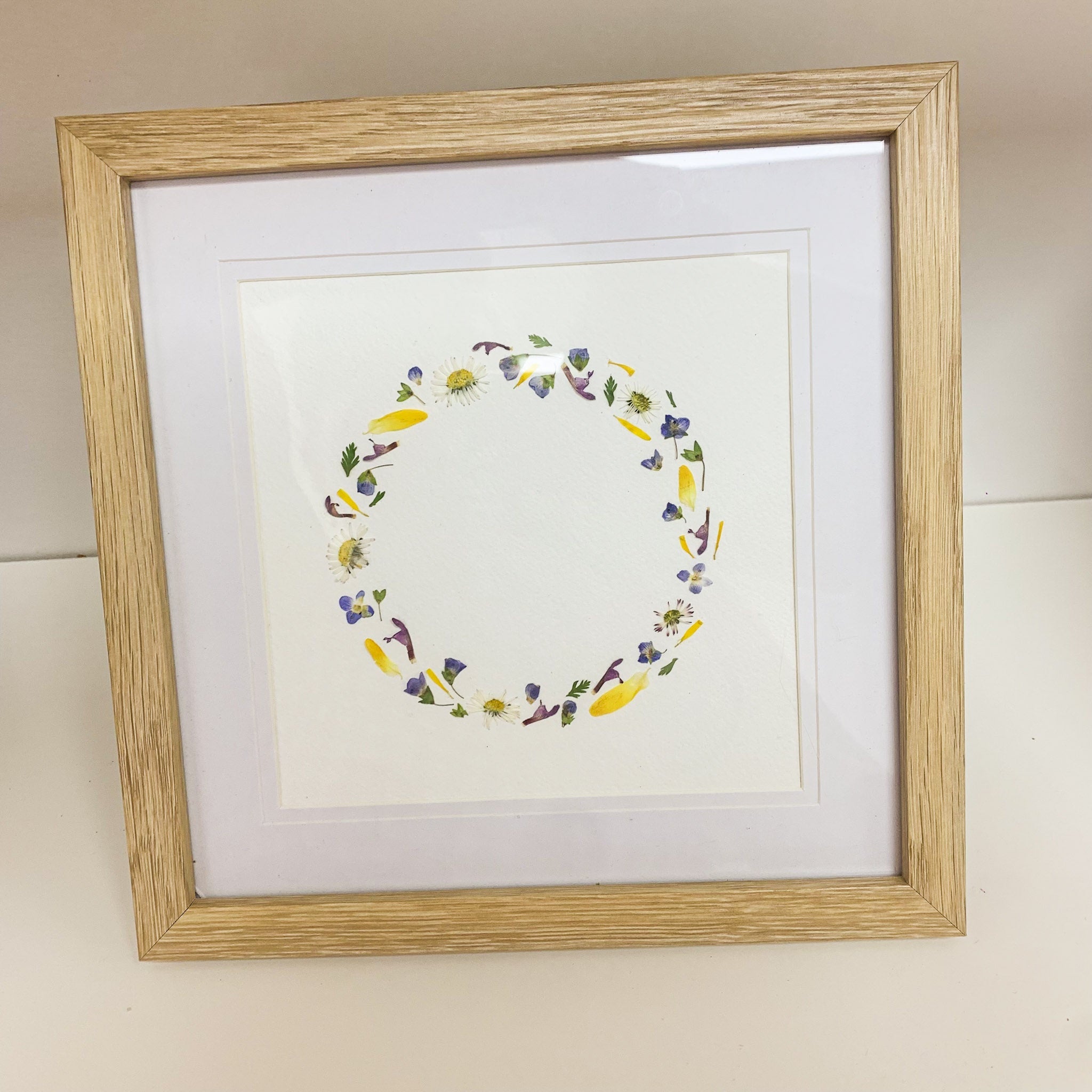 This original pressed flower artwork features creamy lacebark flowers and wild carrot foliage. Each element was hand-picked and pressed before this one-of-a-kind artwork was composed. It measures 22cm by 22cm including the frame.
