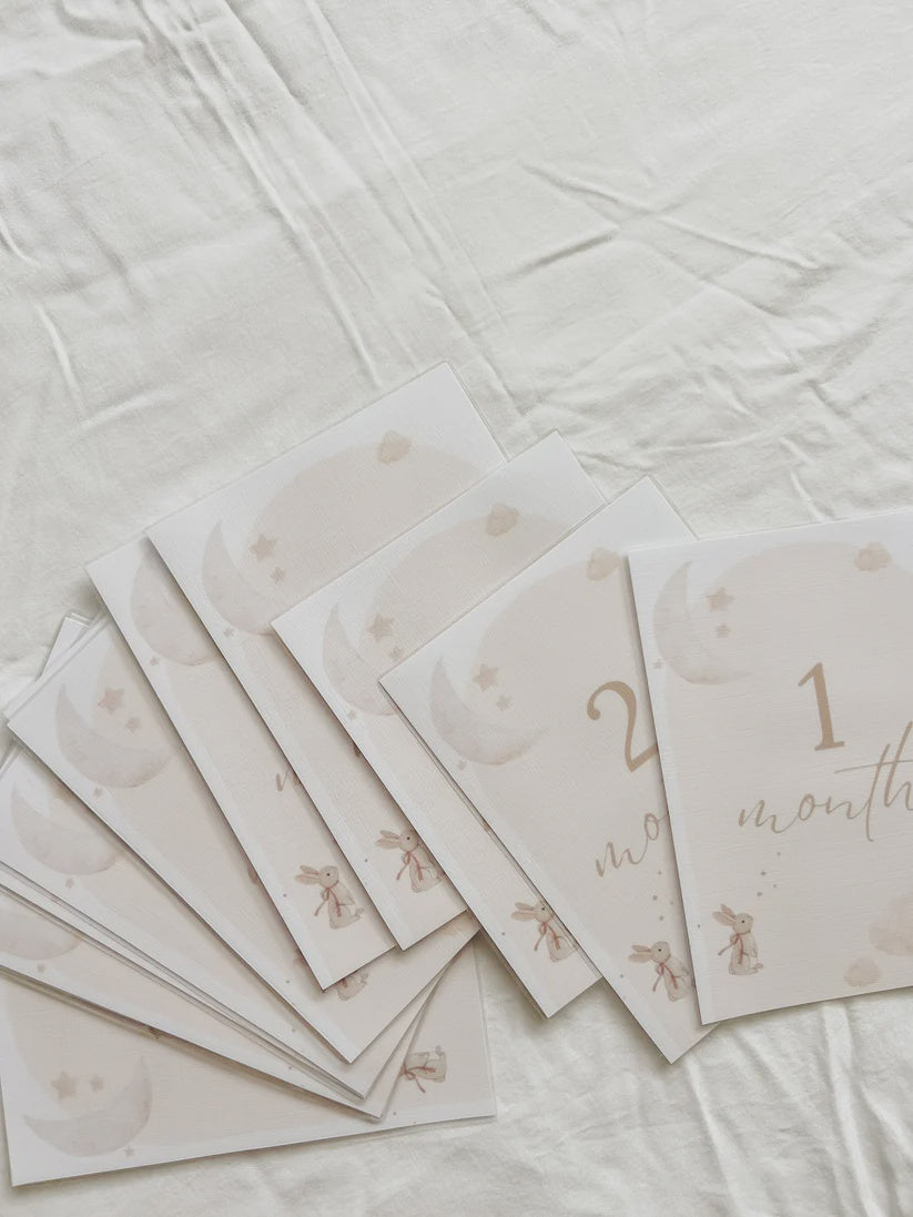 Capture each precious month of your baby’s first year with our gender-neutral monthly milestone cards, designed in soothing earthy tones. This set of 12 beautifully crafted cards features a soft, natural layout featuring a sweet little bunny, gentle clouds, and twinkling stars, making it the perfect addition to any nursery. With a minimalist yet whimsical touch, these milestone cards are ideal for creating timeless memories and stunning photos that you'll cherish forever.
