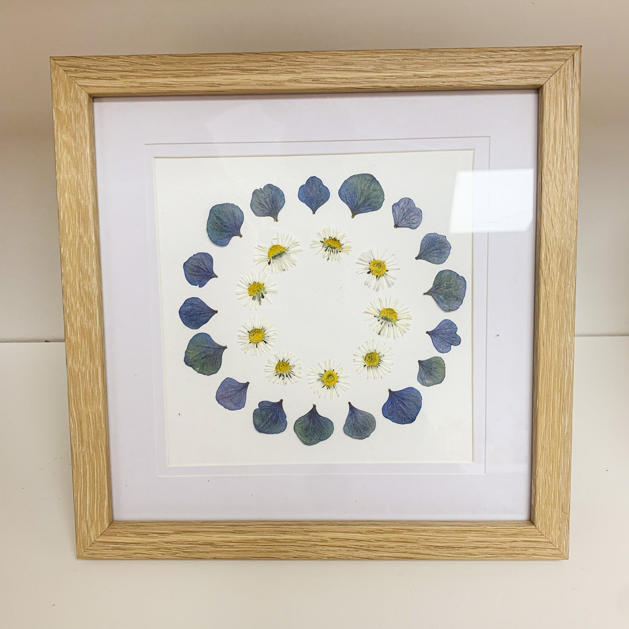 This original pressed flower artwork features creamy lacebark flowers and wild carrot foliage. Each element was hand-picked and pressed before this one-of-a-kind artwork was composed. It measures 22cm by 22cm including the frame.