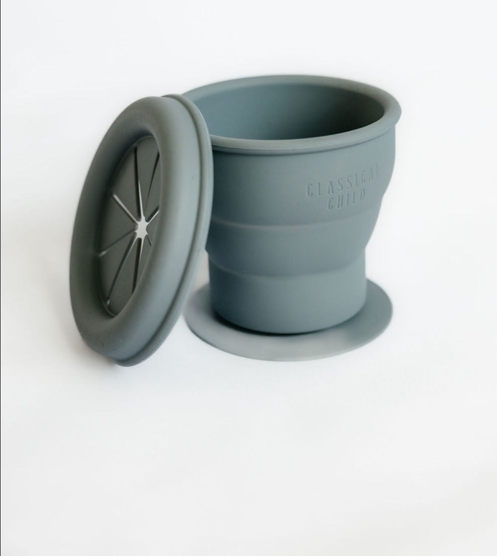 Because snacking doesn't need to be messy. Stop the spills! Crafted in soft silicone, this snack container is designed for on the go convenience. Spill proof lid features special flaps to make it easy for little hands. Shake, throw or tip upside down and the contents stay inside. Removable lid for cleaning. Collapsible to adjust to the amount of contents and for easy storage. Featuring suction to keep it in place on flat surfaces.
