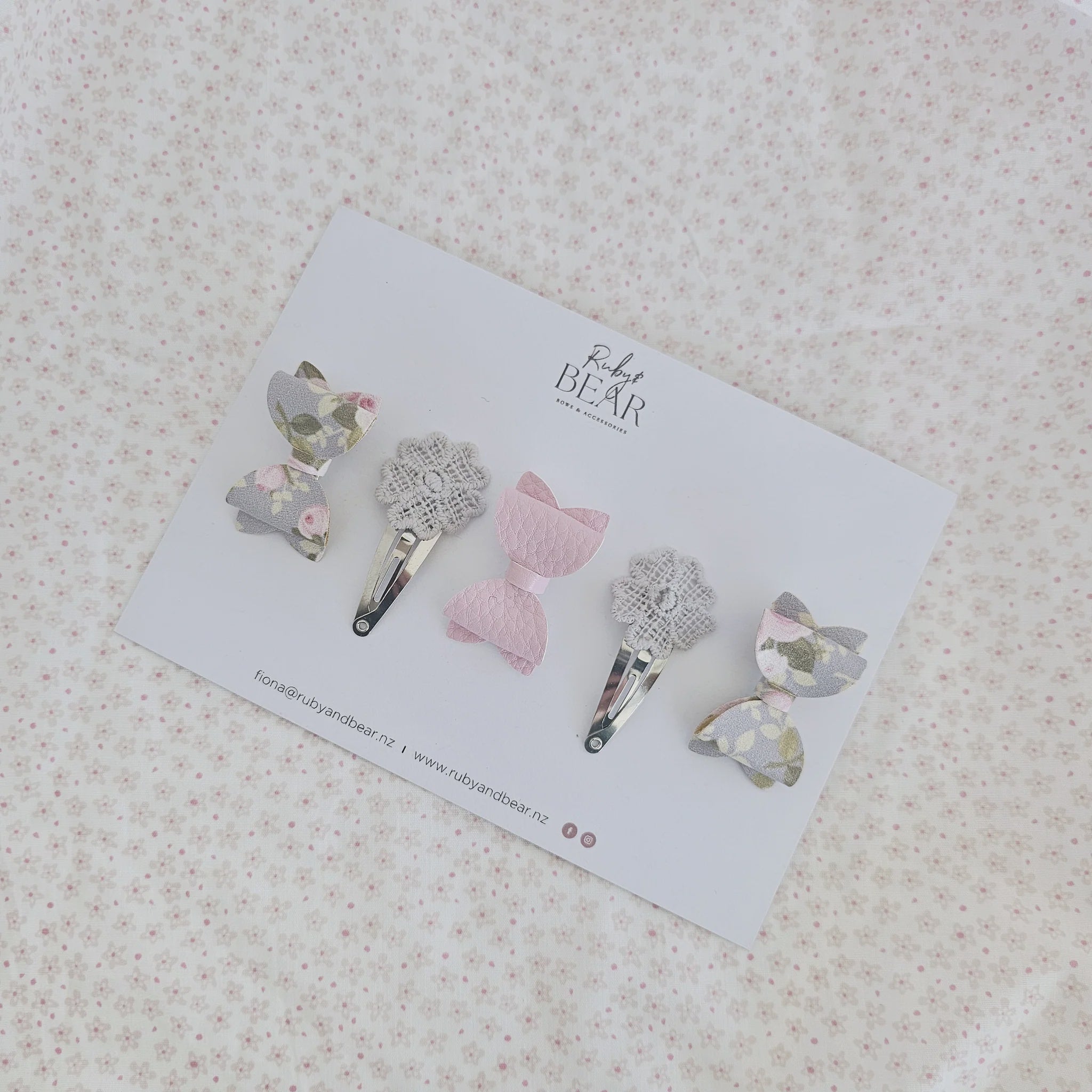 These bows are sold as a set of 5 clips; 2x grey floral snap clipss, 2x grey floral bows, 1x jasmine pink bow. Where there are other accessories in a picture, they're for display only and not included in the price.