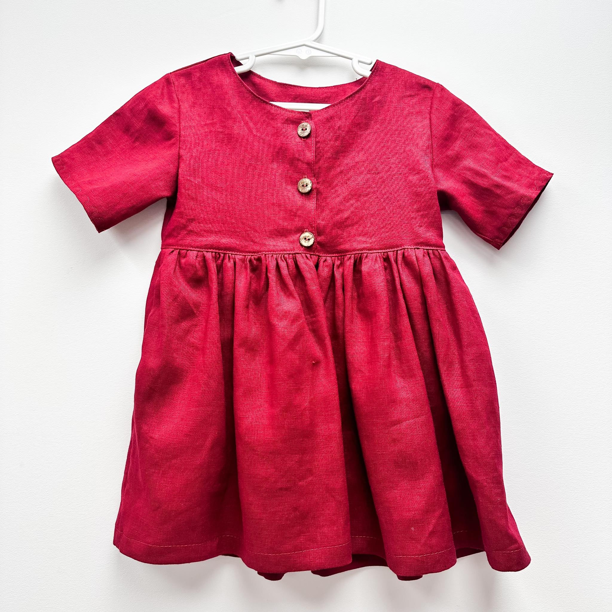 A relaxed fit dress - roomy enough to run and jump and dance in and, being 100% linen, will wash and wear to a beautiful softness. All French seams, two pockets for treasures and buttons down the front for your young one to manage by herself.