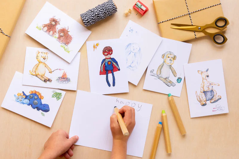 Designed by a local Victorian artist & made in Australia, our captivating cards are a thoughtful accompaniment to the perfect childrens toy (or a handy addition to the present box at home). These versatile hand-illustrated cards are drawn from beloved characters in our collection, allowing you to mix or match with a Nana Huchy soft toy, doll, baby rattle or Hoochy Coochie puppet comforter.