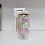 Glass Tumbler with Straw -Daisies Mint/Purple/Pink