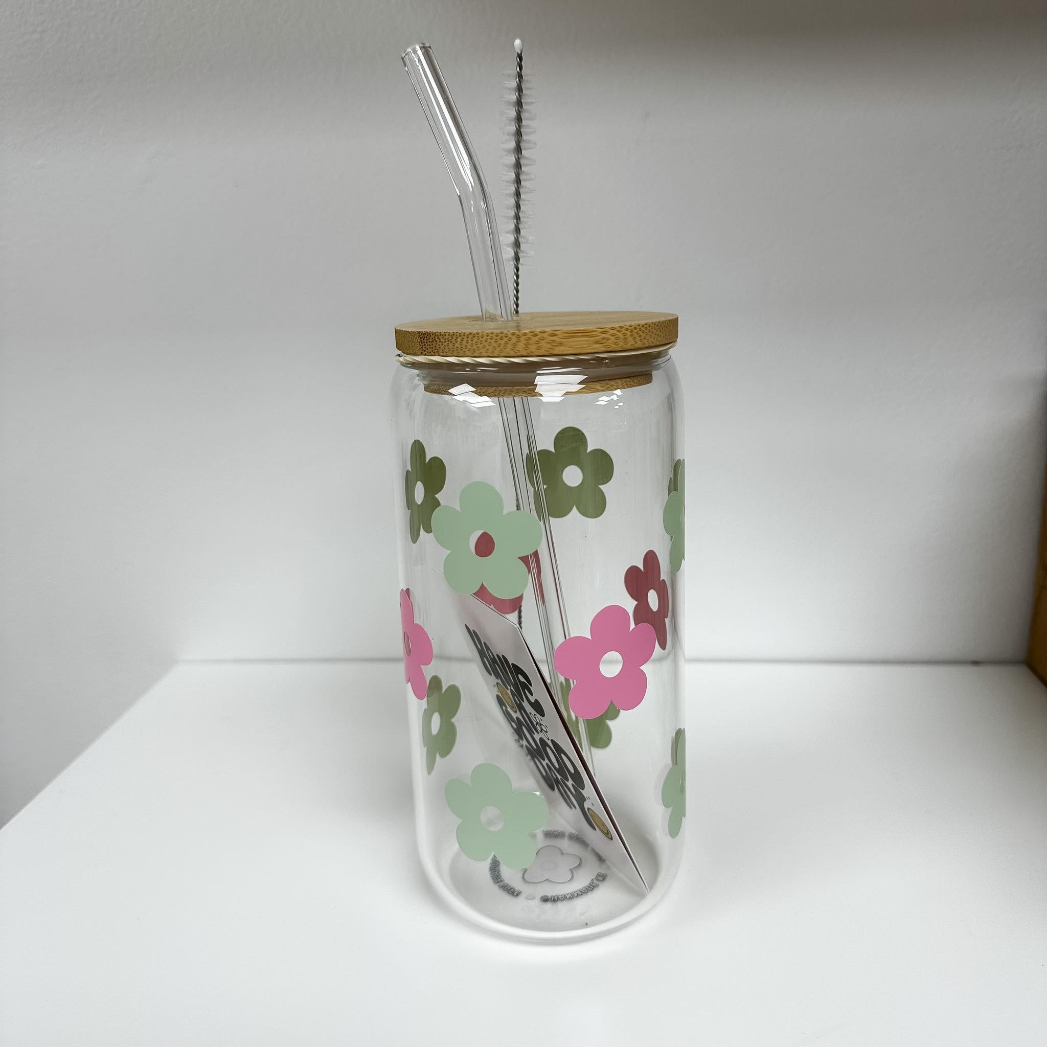 Glass Tumbler with Straw - Light Green/Pink Daises