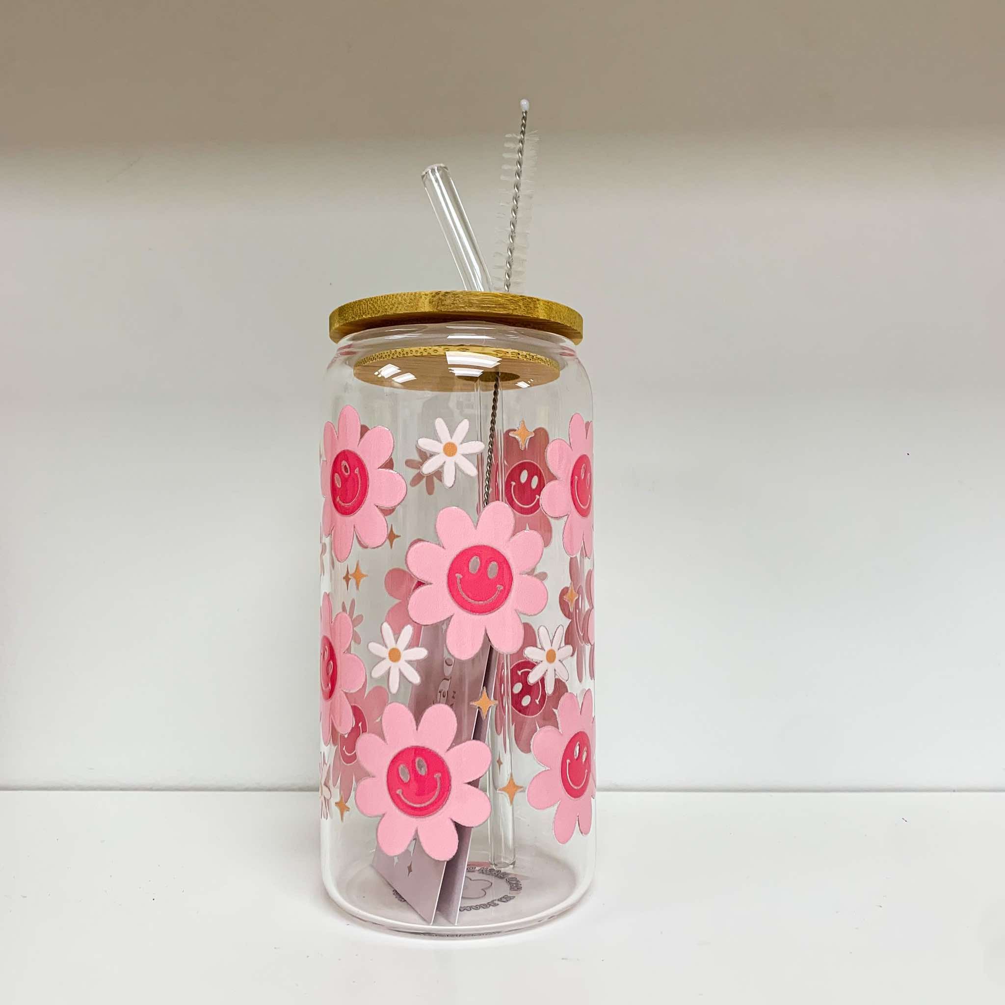 Glass Tumbler with Straw - Pink Daisy / Flowers