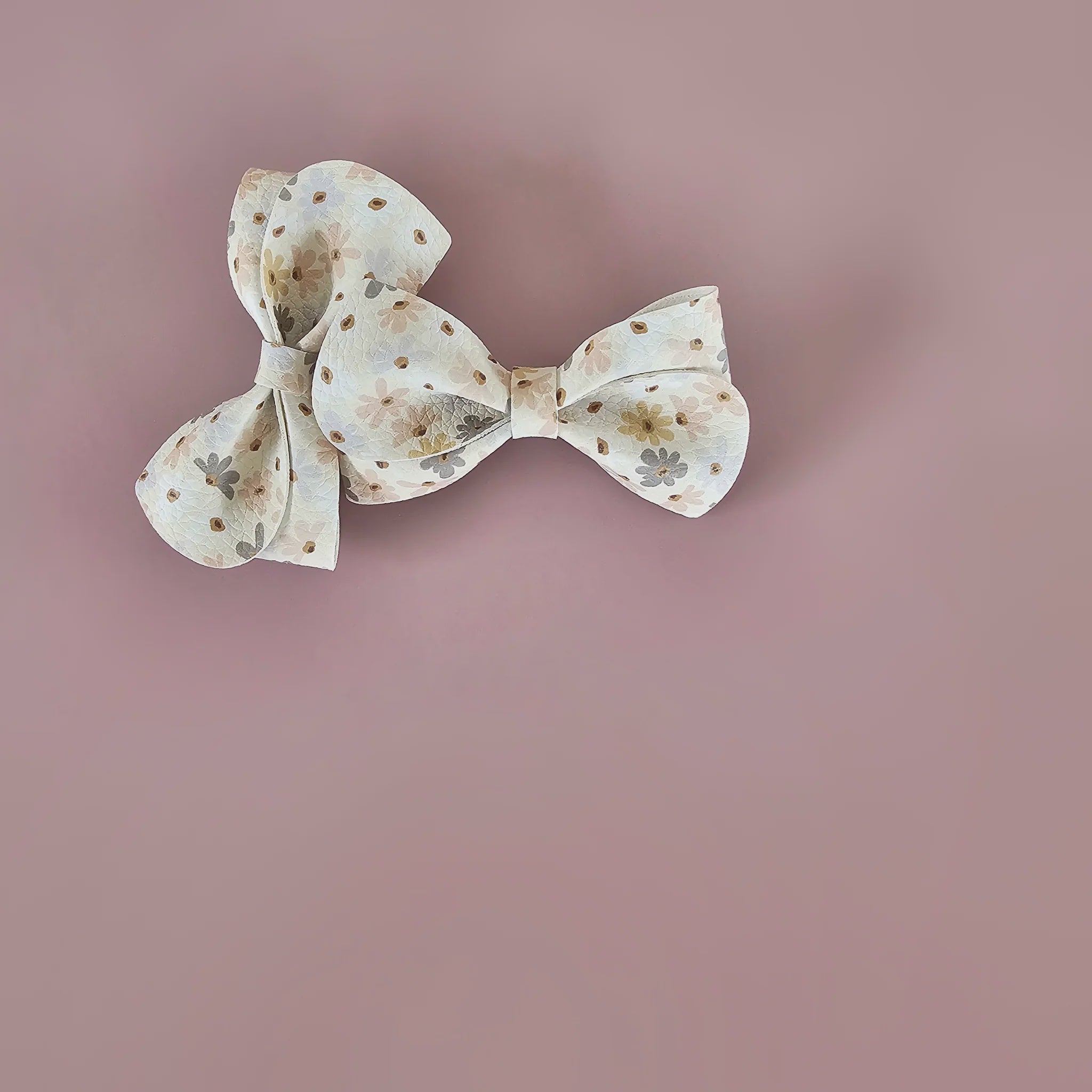 A cute shape with soft curves, and a gorgeous palette of neutral florals that'll go with everything, these New Zealand made bows have been cut from a PU coated soft knit fabric and come set on 4.5cm alligator clips wrapped in grosgrain ribbon, or handstitched onto our non-marking, soft and stretchy headbands. This size measures approx 7.5cm, and coordinates with our little-sister Gracie singles and itty-bitty duos
