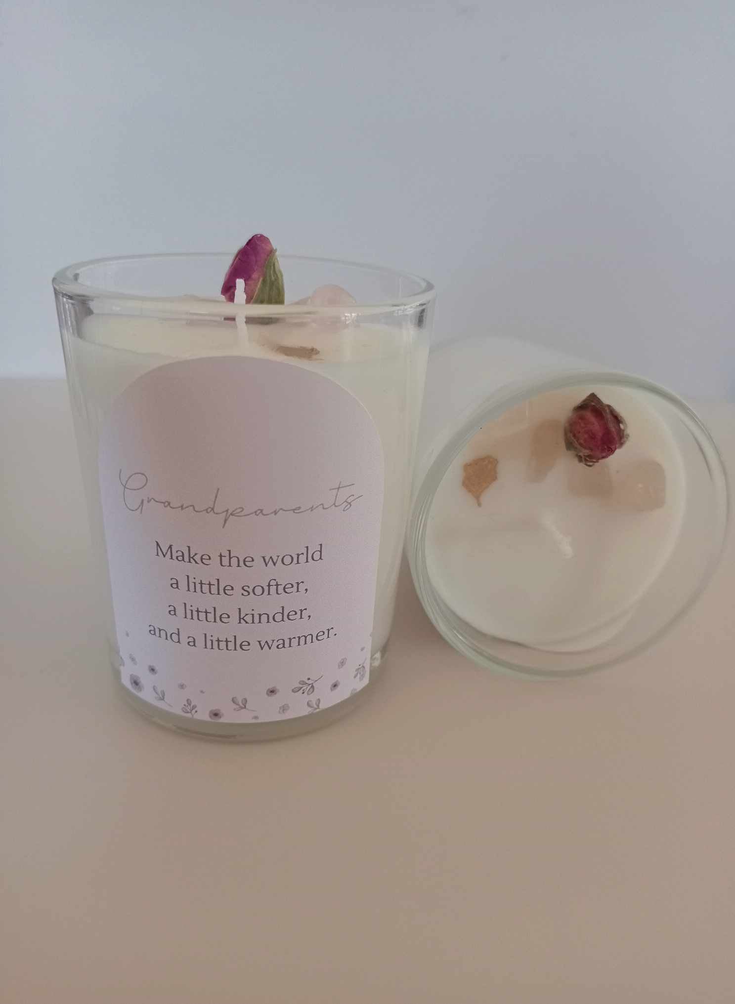 Mini soy candle designed to send encouragement. Crafted with the finest quality soy wax and adorned with stunning gold foil, himilyan salts, a rose bud and rose quartz chips- Known for their ability to promote emotional healing and inner peace whilst adding a touch of elegance and sophistication to its overall aesthetic. Its compact size makes it perfect for gifting, allowing you to send a message of encouragement and support to your loved one let them know that they are not alone.