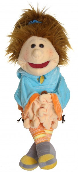 With miniskirt, Living Puppets hooded sweatshirt and trendy silver shoes. Skirt can be removed. Size 45 cm.