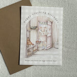 All illustrations are hand painted by us with watercolor paints and then printed within Christchurch. Cards are Indigo printed on 250gsm textured natural white stock. They are A6 size, 148mm x 210mm and come packaged in a clear cello bag with a Kraft envelope.