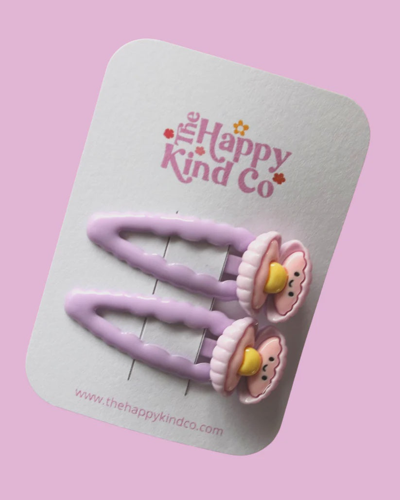 These dreamy 5cm snap clips feature the sweetest happy clam embellishment in the prettiest pastel purple shade!