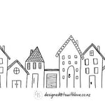 Black houses printed on 100% linen cotton tea towel