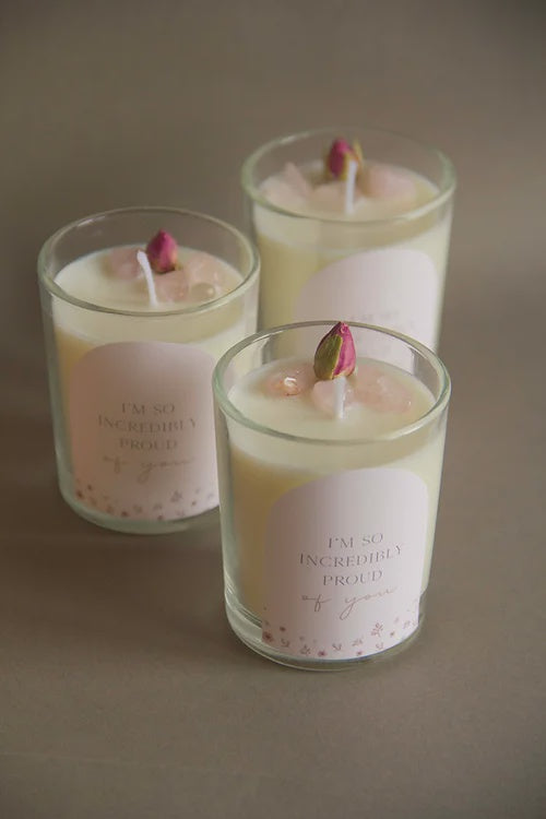 Mini soy candle designed to send encouragement. Crafted with the finest quality soy wax and adorned with stunning gold foil, himilyan salts, a rose bud and rose quartz chips- Known for their ability to promote emotional healing and inner peace whilst adding a touch of elegance and sophistication to its overall aesthetic. Its compact size makes it perfect for gifting, allowing you to send a message of encouragement and support to your loved one let them know that they are not alone.