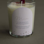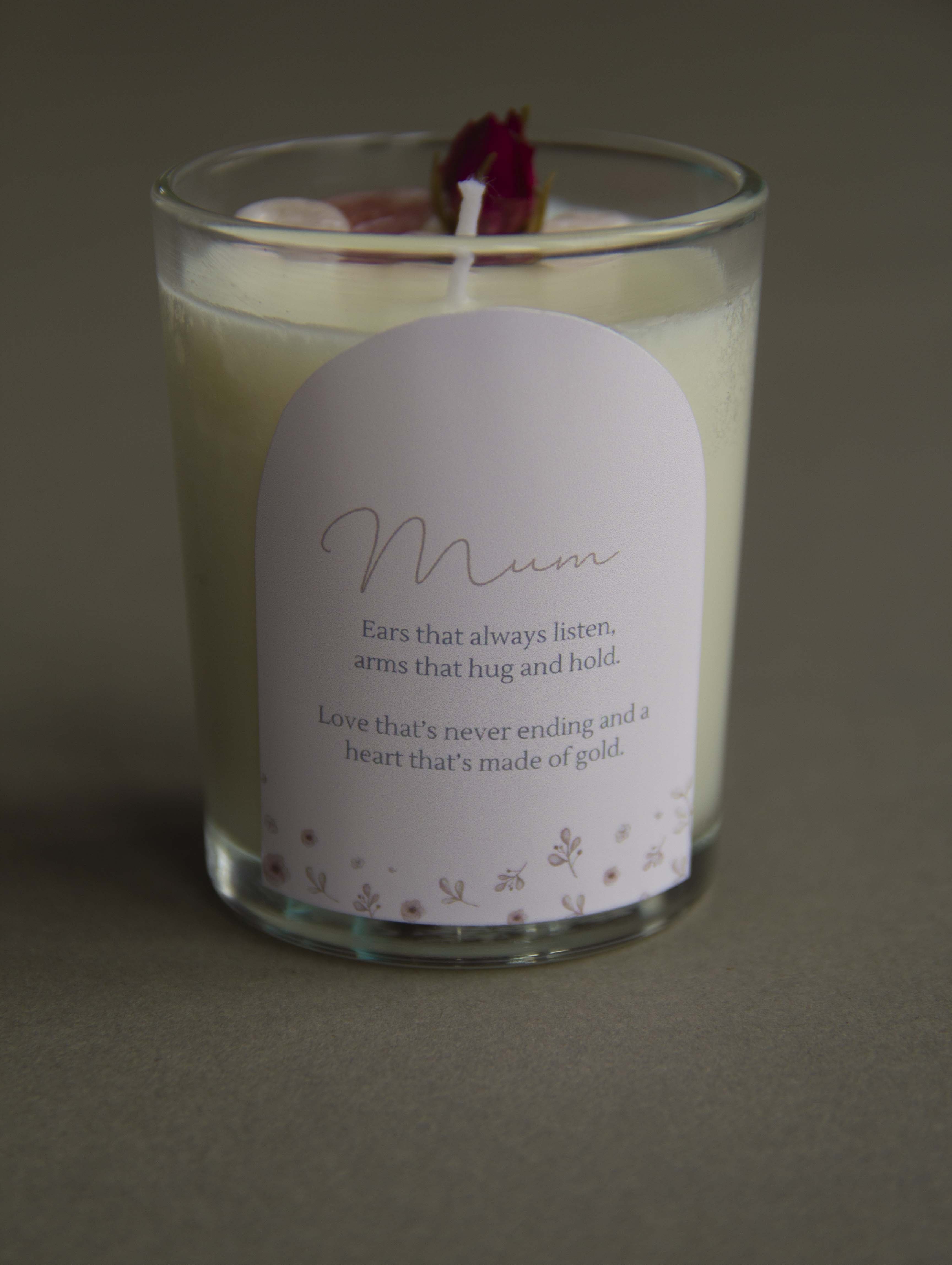 Mini soy candle designed to send encouragement. Crafted with the finest quality soy wax and adorned with stunning gold foil, himilyan salts, a rose bud and rose quartz chips- Known for their ability to promote emotional healing and inner peace whilst adding a touch of elegance and sophistication to its overall aesthetic. Its compact size makes it perfect for gifting, allowing you to send a message of encouragement and support to your loved one let them know that they are not alone.