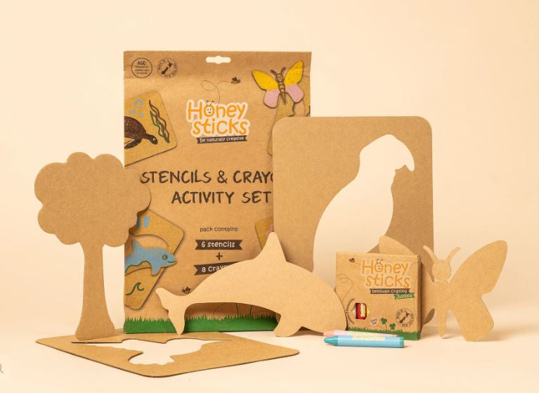 Introducing our handy Activity Set – featuring fun mega stencils! Includes an eight-pack of our best-selling Honeysticks crayons along with 6 fun jumbo-size stencils. One buzz-worthy gifting bundle; safer for kids, better for the planet.