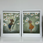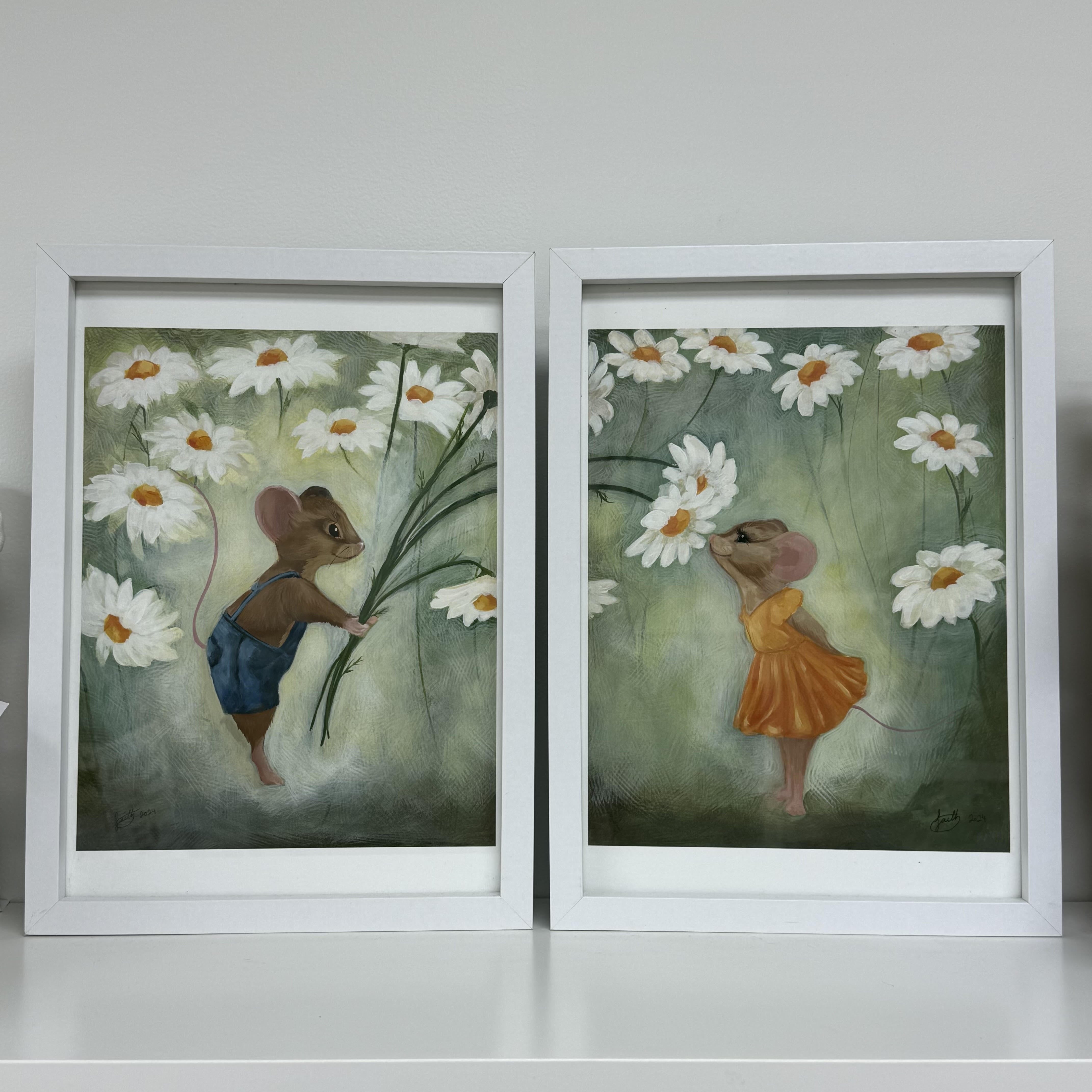 Available individually or as a perfectly paired set, the two prints are designed to complement one another—when hung side by side, the little mice appear to come together, sharing their daisies in harmony.