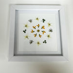 This original pressed flower artwork features creamy lacebark flowers and wild carrot foliage. Each element was hand-picked and pressed before this one-of-a-kind artwork was composed. It measures 15cm by 15cm including the frame.