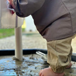 Our signature mud pocket is thoughtfully positioned at the front of the smock so that it can be used by little hands start collecting precious treasures at the park. just like our water resistant rain pants, they can also be rolled up and tucked into our mud pocket before and after use.