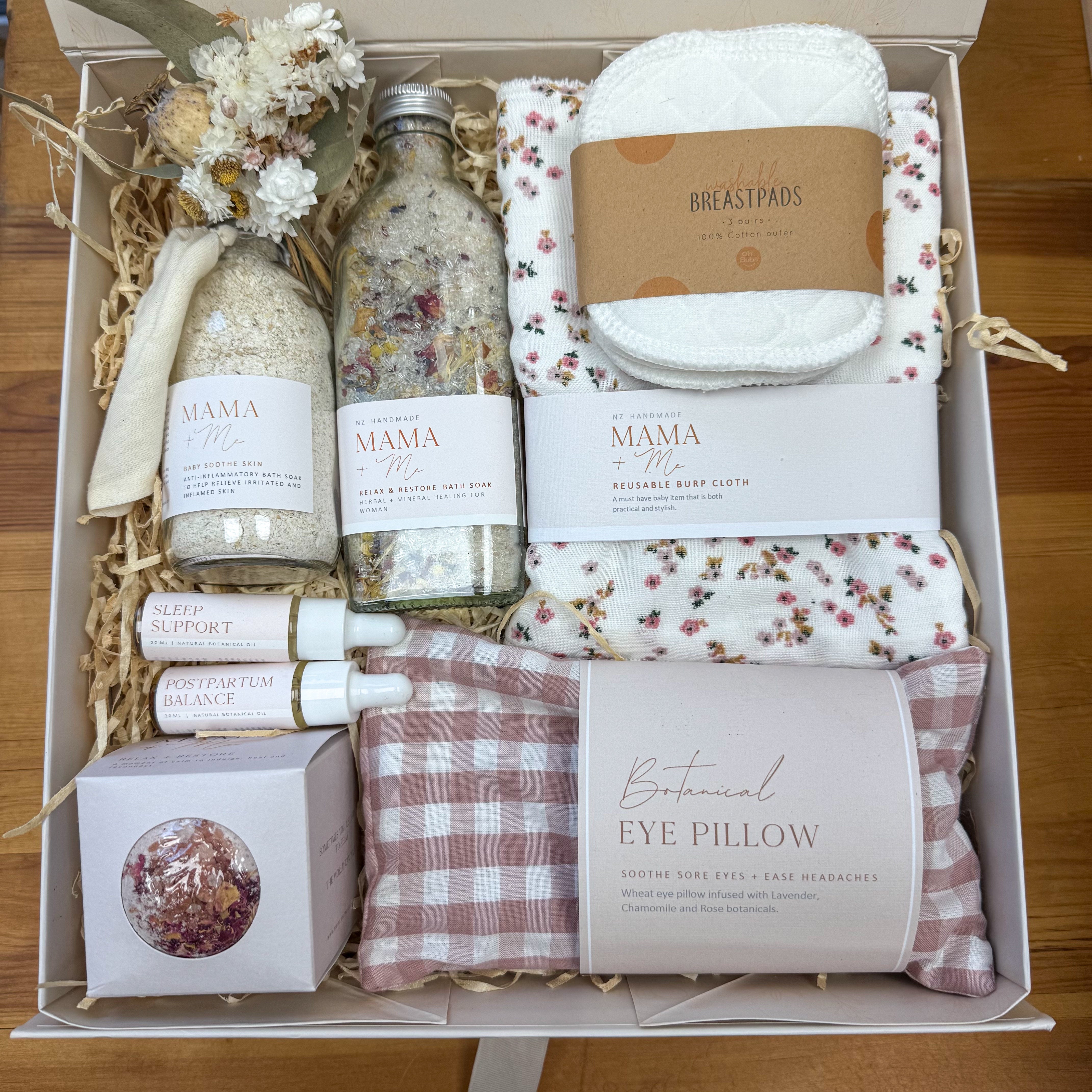 A beautifully curated box filled with handmade natural products to treat any mother. The box is a light nude colour with a subtle 'mother nature' inspired botanical print on the inside + rose gold details on the ribbon & box top "A little something just for you"