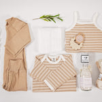 Inside, you will find an assortment of essentials made from the finest organic fibres. Our non-dyed organic cotton rompers ensure ultimate softness against delicate skin, while the long sleeve bodysuit offer added warmth during cooler days.