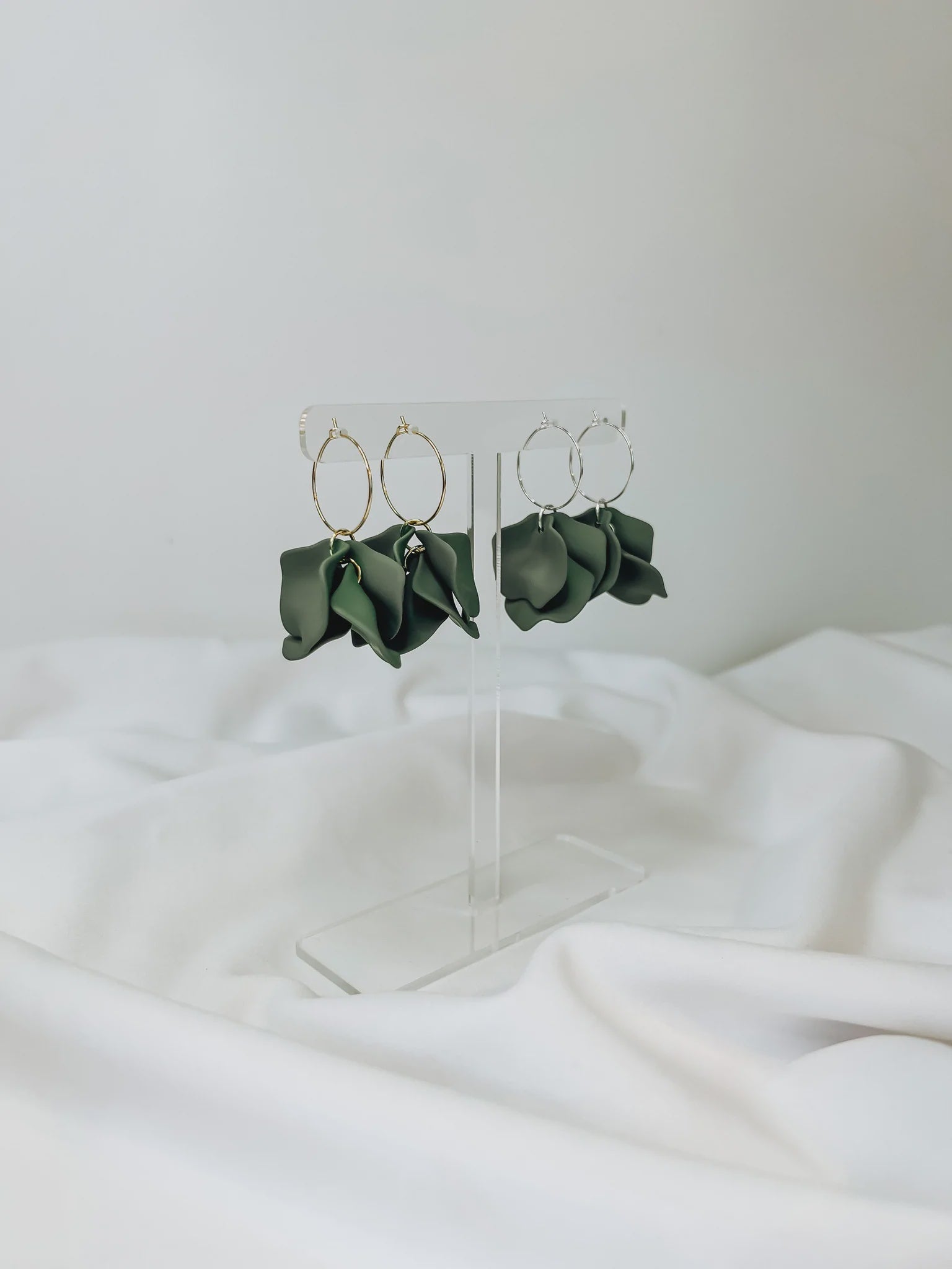 Personalise your petal drop earrings with a choice of colours, from Pinky Nude to Sage or Black, complemented with either a gold or silver finish.