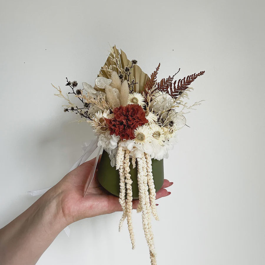 A white coloured pot with beautiful complementary dried florals styled within the pot. Perfect for a shelf or bed side table.