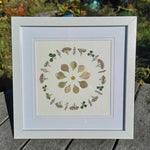 This original pressed flower artwork features creamy lacebark flowers and wild carrot foliage. Each element was hand-picked and pressed before this one-of-a-kind artwork was composed. It measures 22cm by 22cm including the frame.