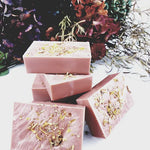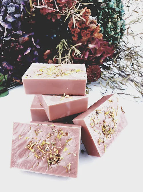 A lush and deliciously smelling body soap with pink clay, kaolin clay and calendula flowers. This soap has added calendula extract suitable for irritated or sensitive skin. Opt for a solid soap bar as opposed to a liquid body wash in a bottle and reduce plastic waste in your personal care products. 110 grams.