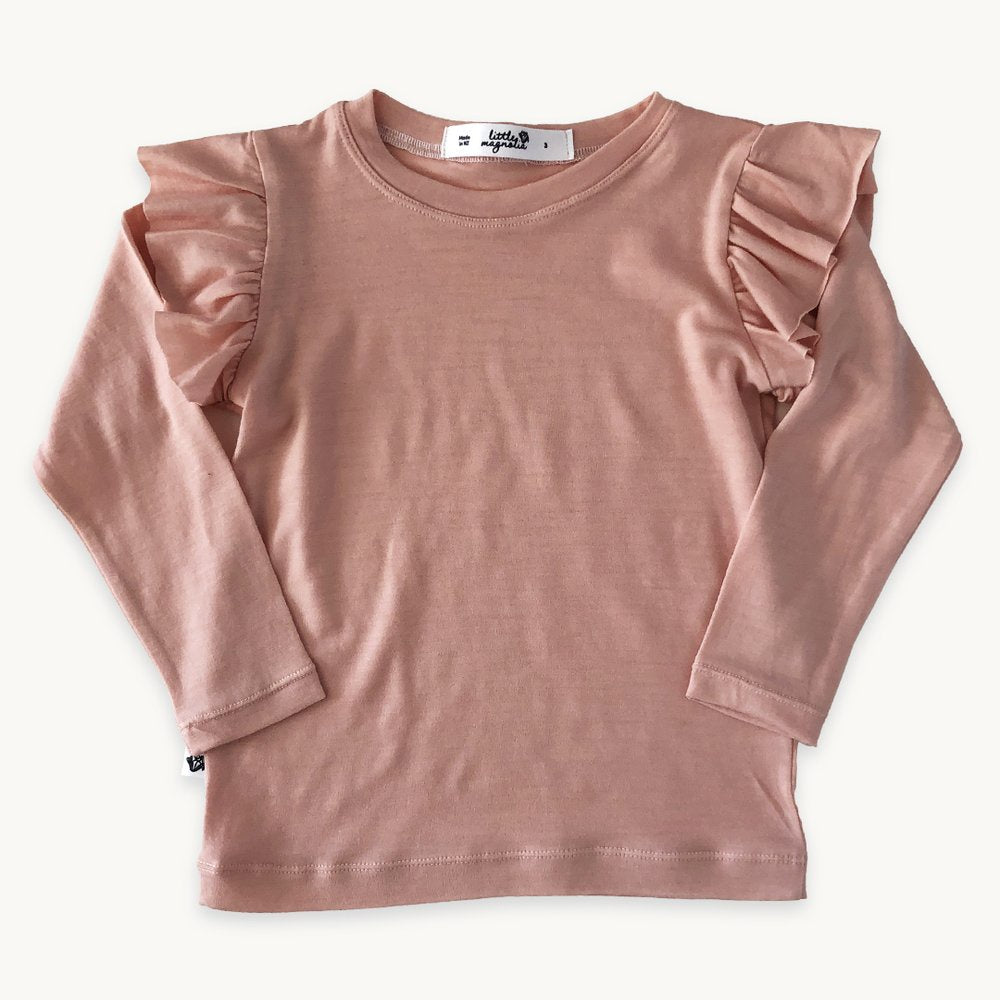 Our Rose Merino Top features a long sleeve with a beautiful flutter detail at the shoulder. It has a crew neckline and is generous in length