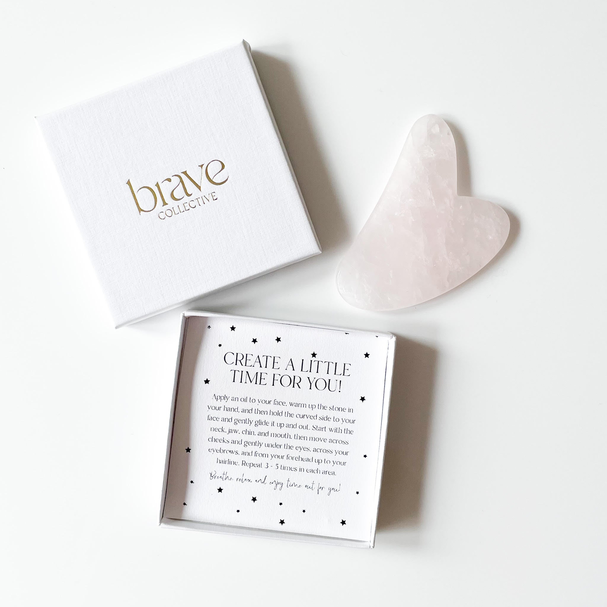 Apply an oil to your face, warm up the stone in your hand, and then hold the curved side to your face and gently glide it up and out.
