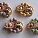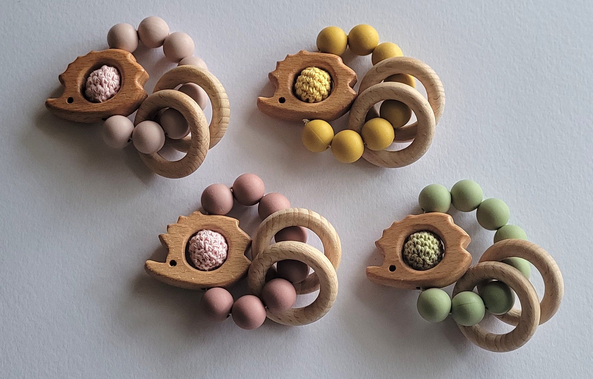 Silicone + Beech Teether Ring With Crochet - Hedgehog