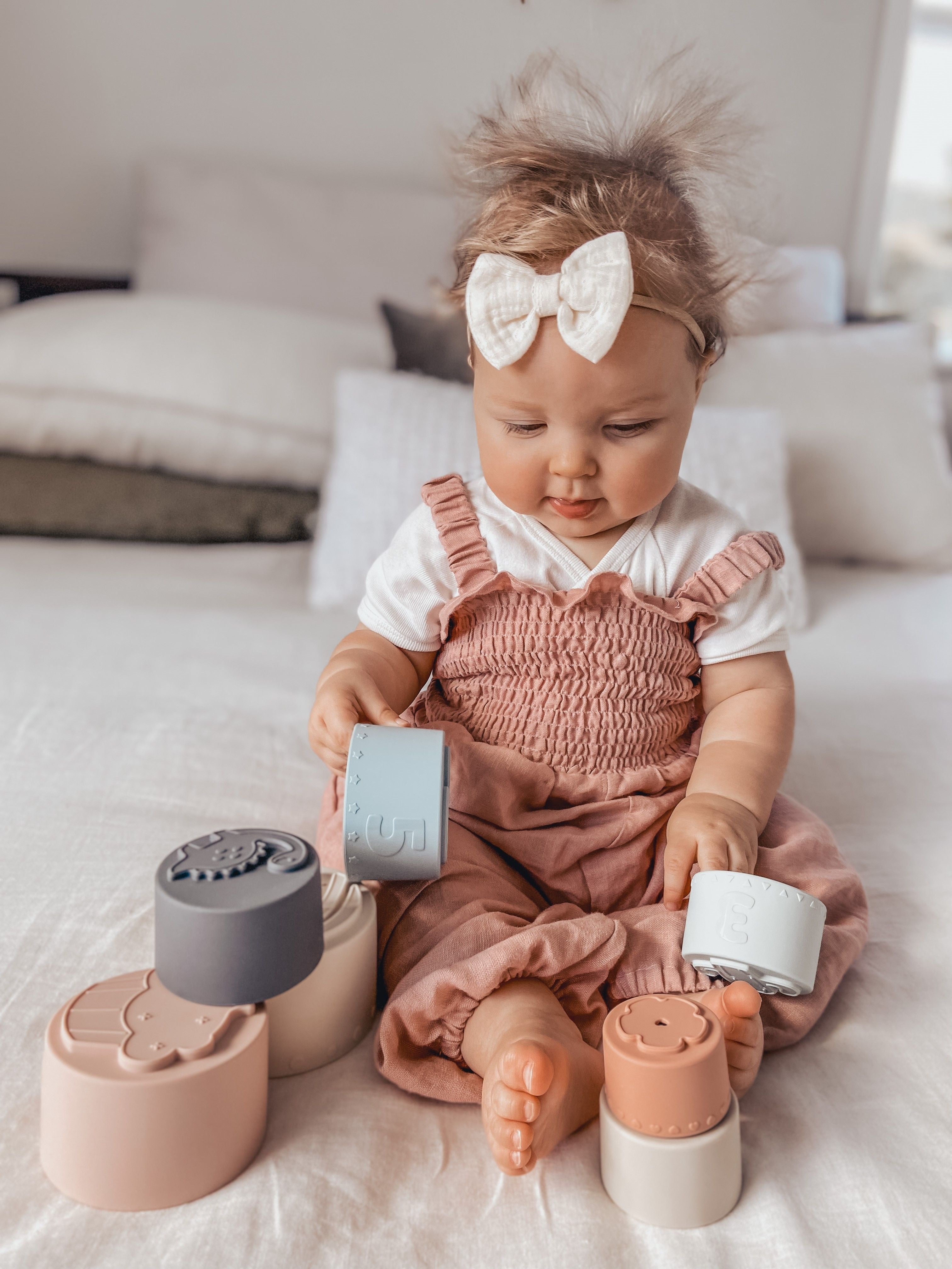 Stacking and grasping the toys helps to