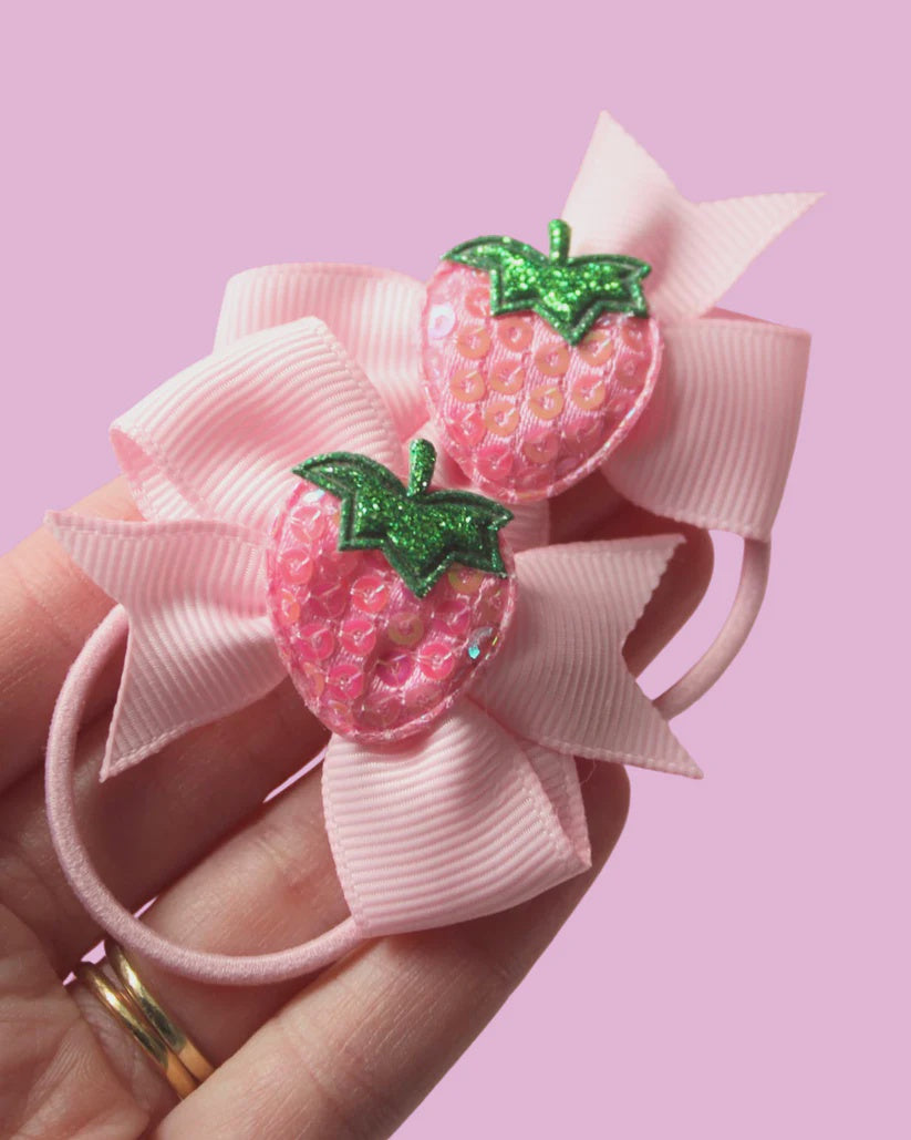 These girly bow hair ties measure approx. 6cm wide x 3cm tall, each finished with a large sequin strawberry embellishment that glitters with every move. Secured on a 4cm elastic with excellent stretch capacity, they’re perfect for dressing up pigtails, ponytails, or fun updos.