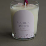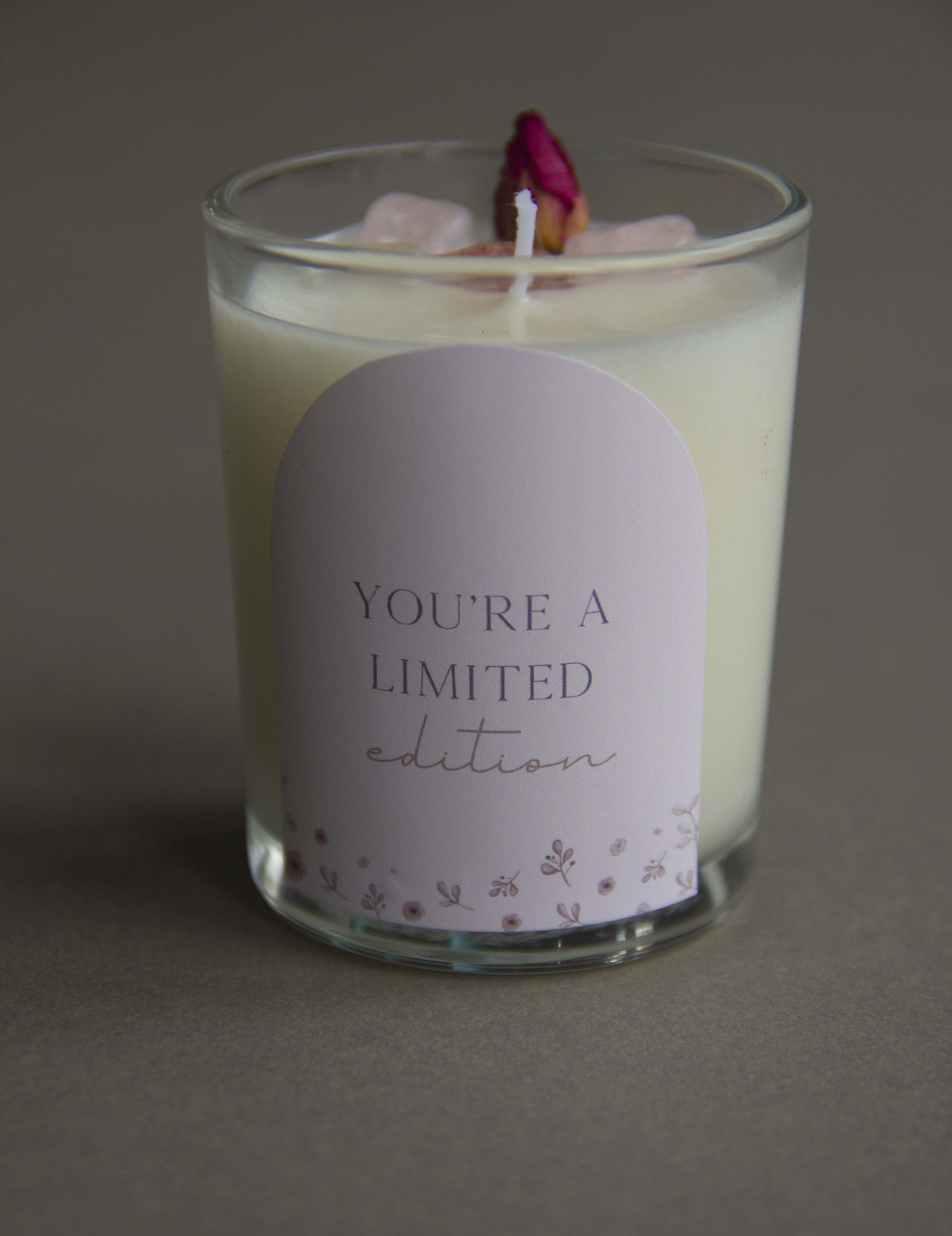 Mini soy candle designed to send encouragement. Crafted with the finest quality soy wax and adorned with stunning gold foil, himilyan salts, a rose bud and rose quartz chips- Known for their ability to promote emotional healing and inner peace whilst adding a touch of elegance and sophistication to its overall aesthetic. Its compact size makes it perfect for gifting, allowing you to send a message of encouragement and support to your loved one let them know that they are not alone.