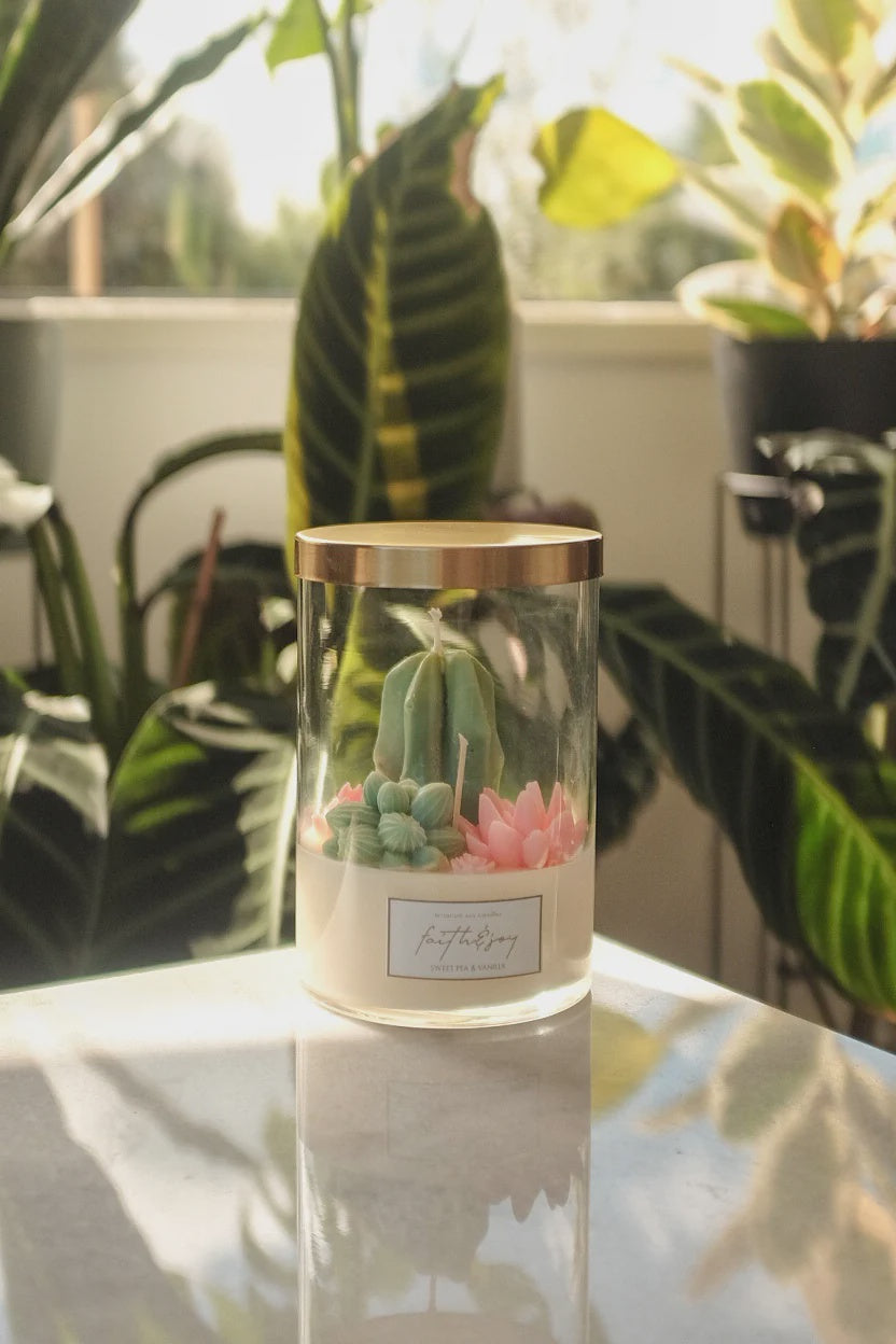 The unique cactus design candle arrangement adds a touch of natural charm to any room in your house, making it the perfect addition to your home décor. Comes with a gold metal brushed lid.